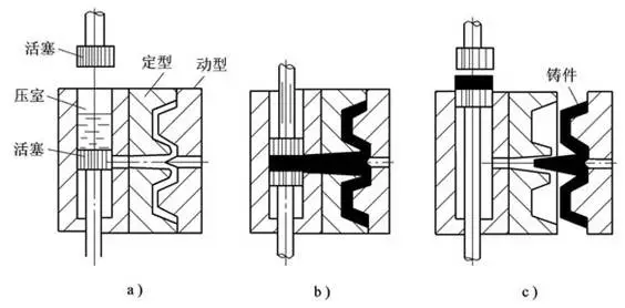 a)合型澆注 b) 壓射 c) 開型頂件